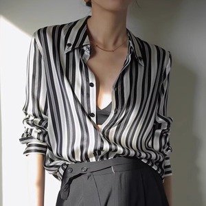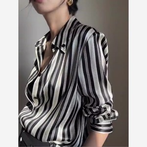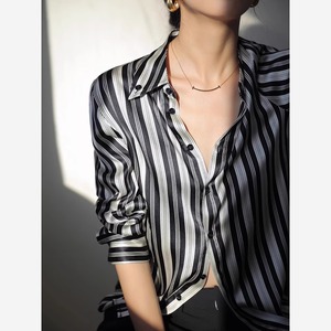 シャープなブラックストライプが大人の雰囲気を演出するスタイリッシュなシャツ。