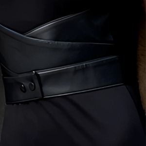 ウエストに添えたレザーベルトがコーディネート全体に立体感を生み出し、都会的でクールなエッジをプラス。