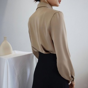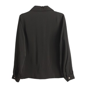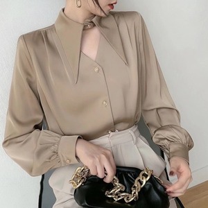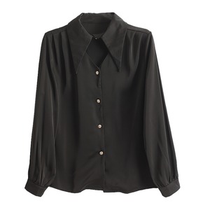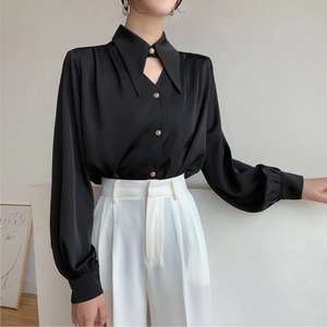 大きめの襟と首元のカットアウトデザインが印象的なブラウス。