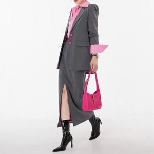 ピンクのステッチとボタンが効いた、洗練グレーのセットアップ。