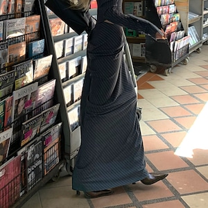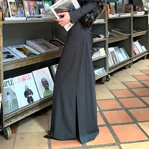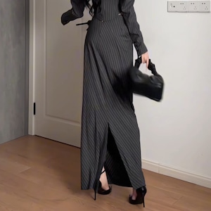 ピンストライプ柄が全体を引き締め、都会的なムードを演出します。