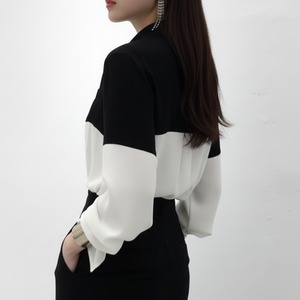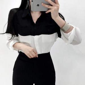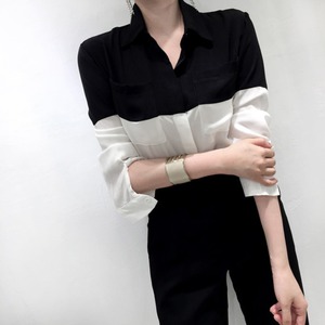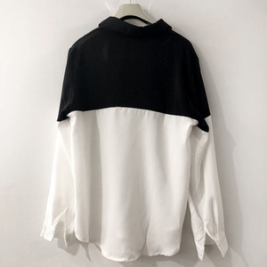 ブラックとホワイトの大胆な切り替えが印象的なバイカラーシャツ。