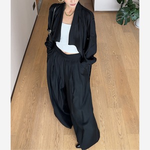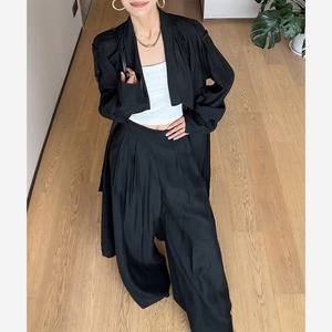 ジャケットのドレープとワイドパンツのボリュームが生み出す、