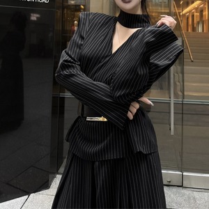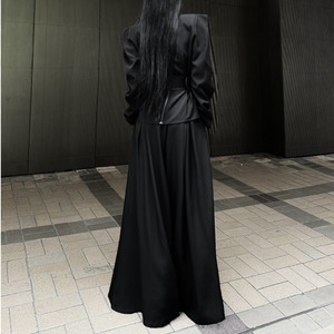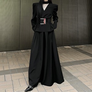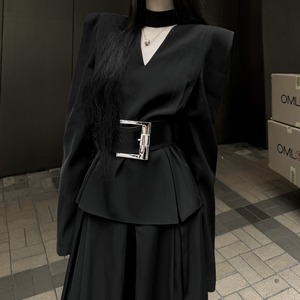 構築的なVネックと太ベルトが映える、モードなブラックセットアップ。