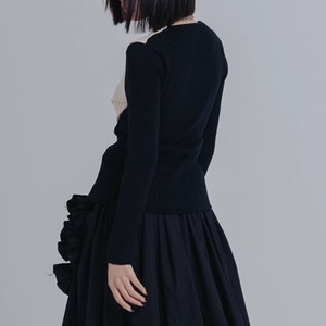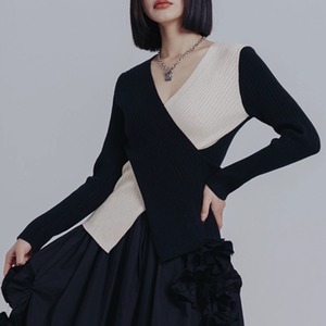 Vネックがデコルテを美しく見せ、アシンメトリーな切り替えがモード感を演出します。