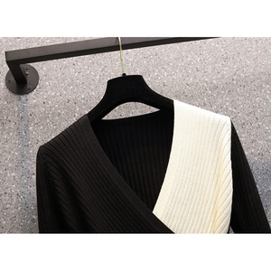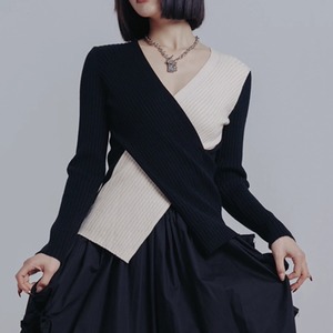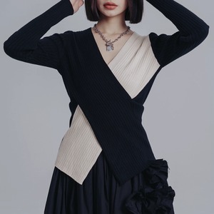 クロスする配色デザインが目を惹く、ラップ風のリブニット。