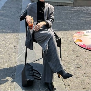 クラシックなピンストライプに、ノーカラーのロングジャケットで今っぽさをプラス。