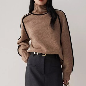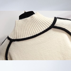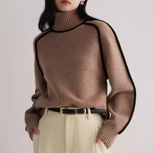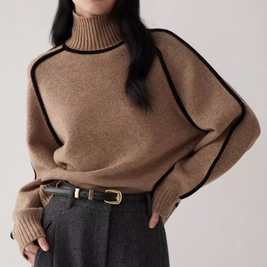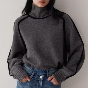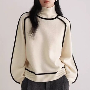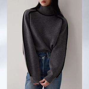 縁取りのように施されたブラックラインが印象的な、ラインアクセントタートルニット。