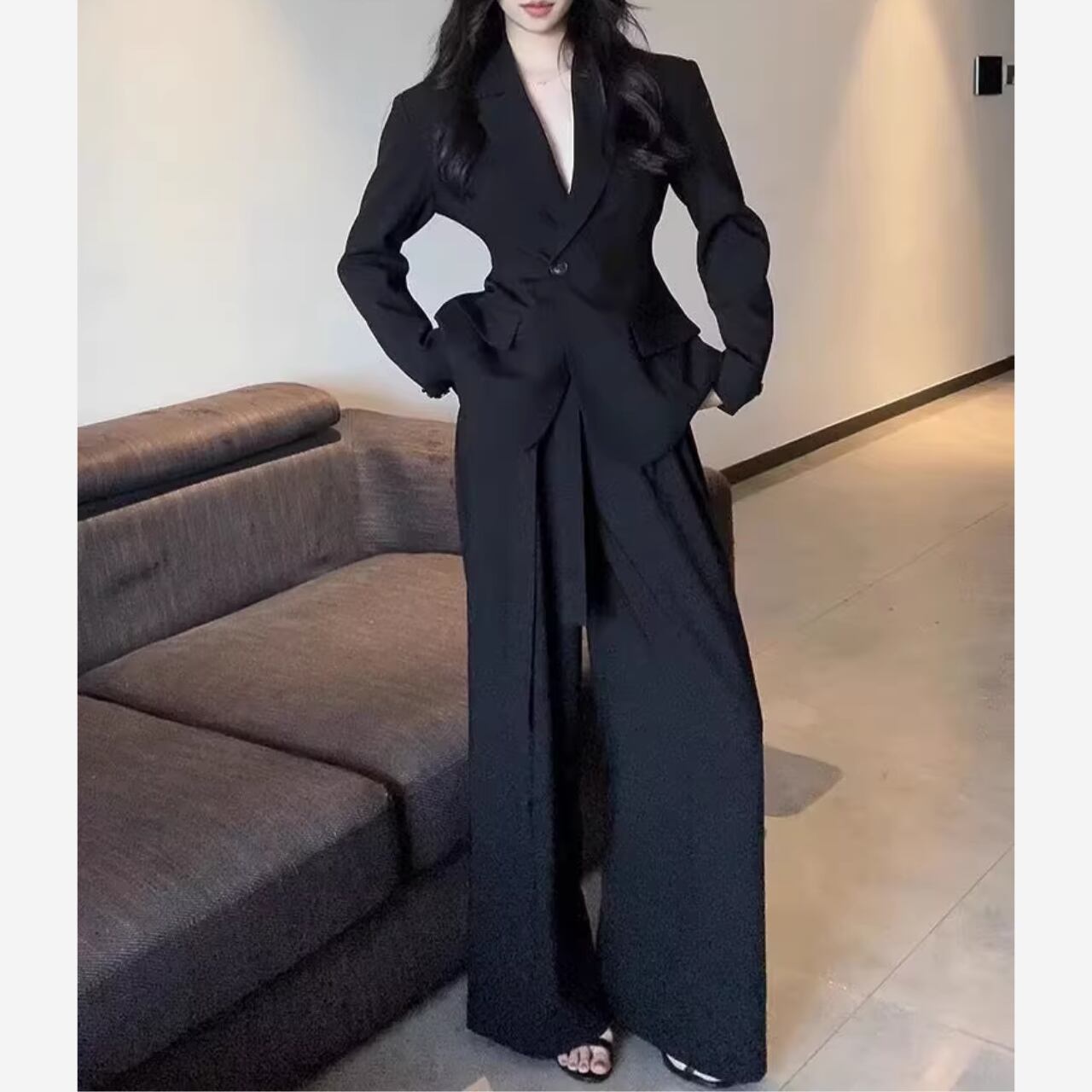 美しく構築されたジャケットに、共布ベルトが揺れるワイドパンツを組み合わせたテーラードラップセットスーツ。