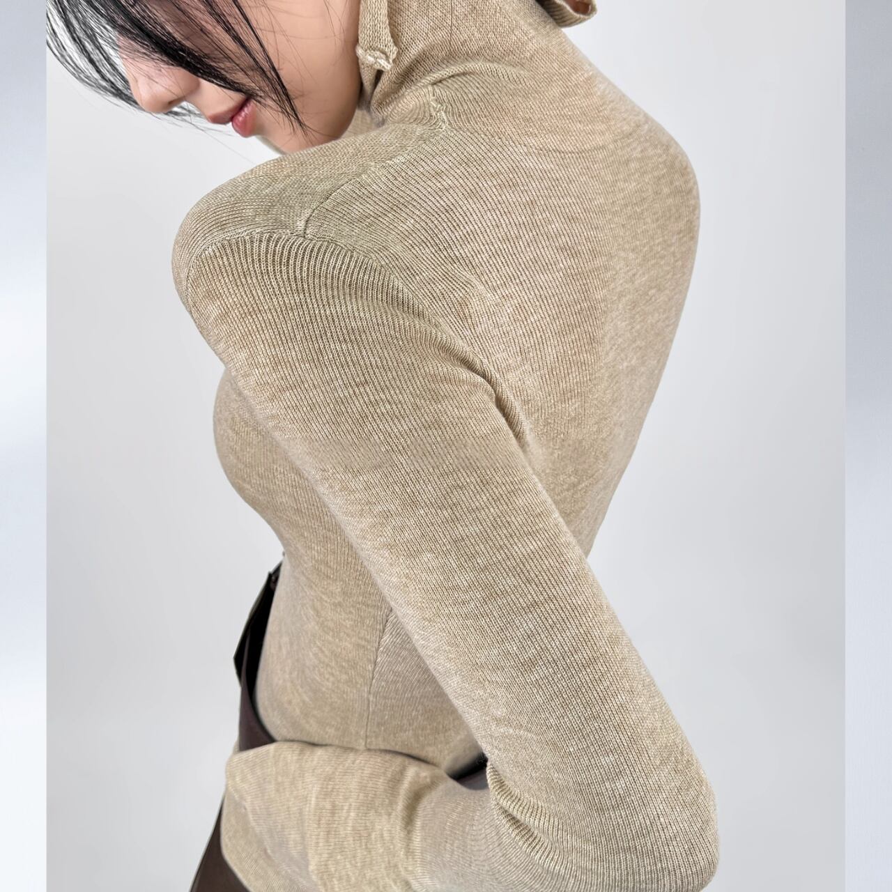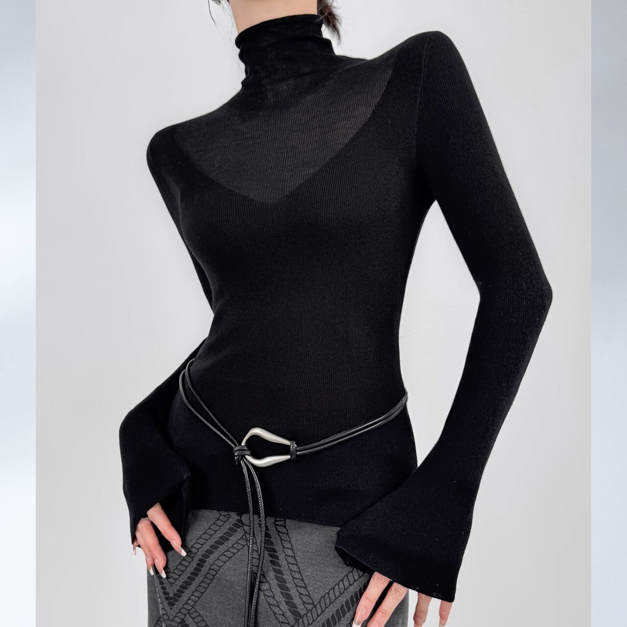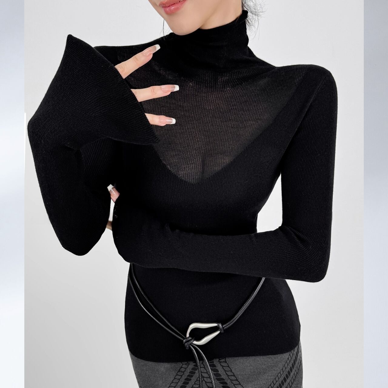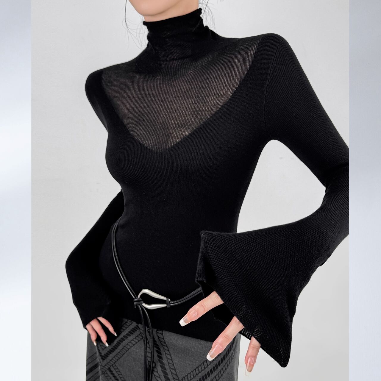 ボディラインに沿うリブと、広がるフレアスリーブのバランスが美しく、着るだけで洗練された印象に。