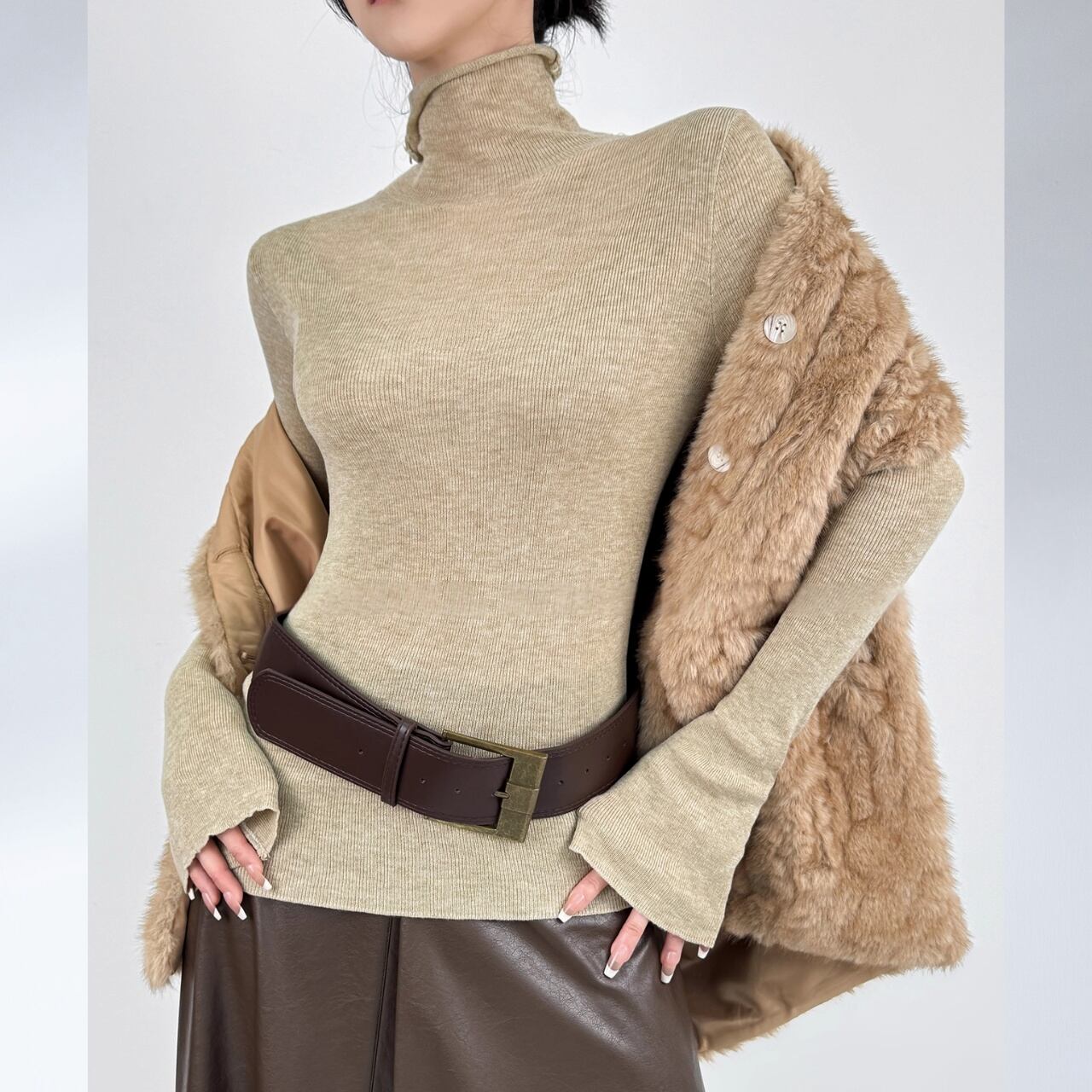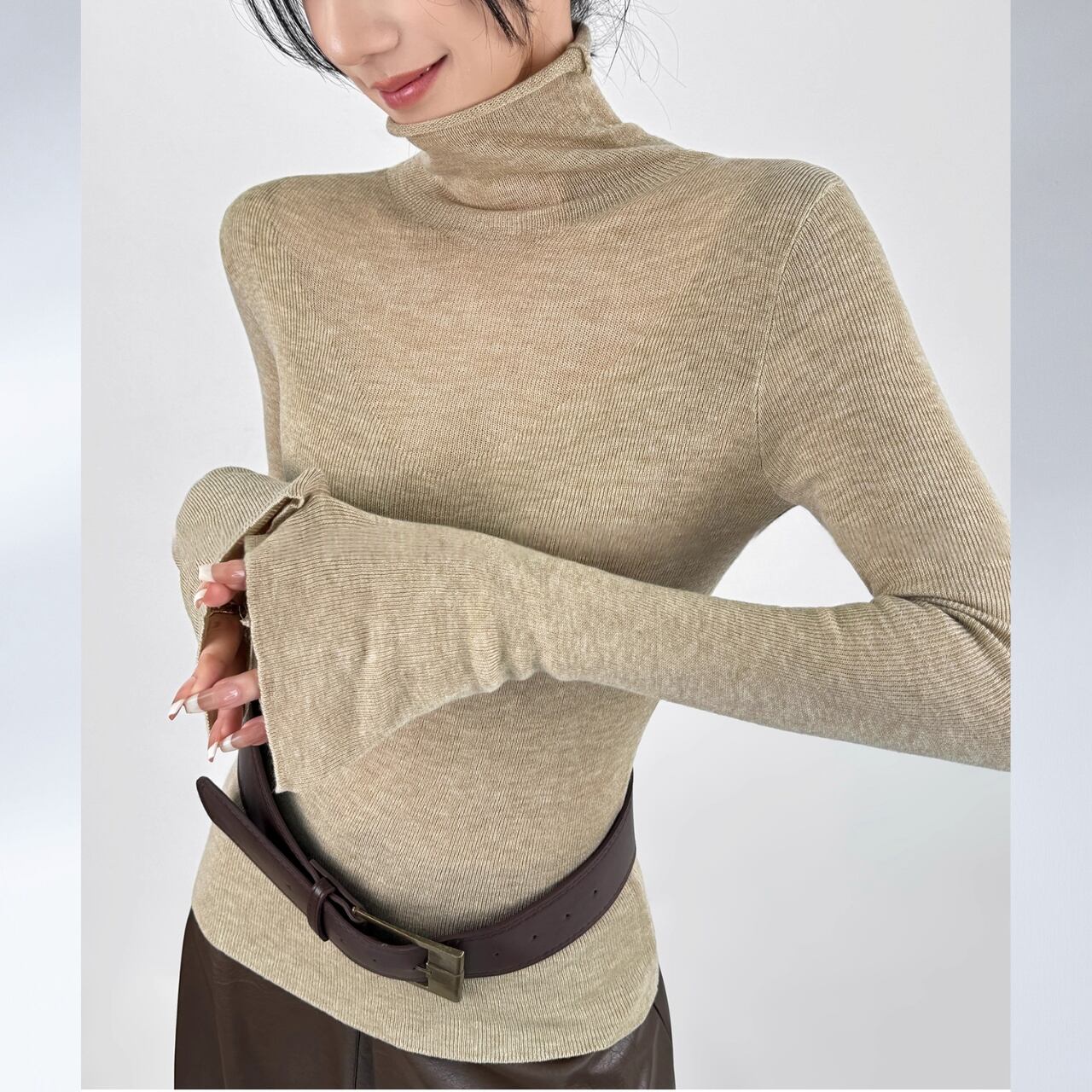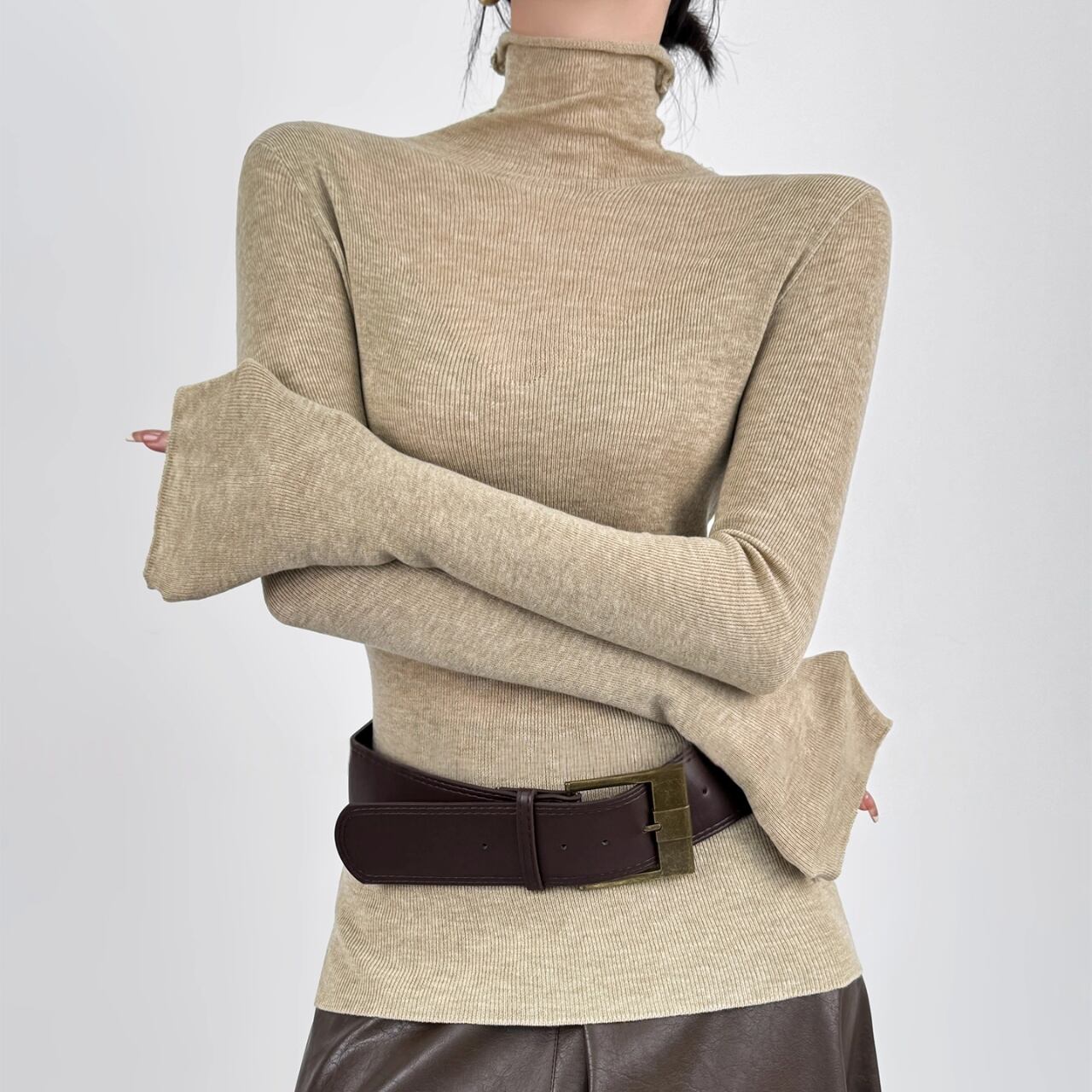 ボディラインに沿うリブと、広がるフレアスリーブのバランスが美しく、着るだけで洗練された印象に。