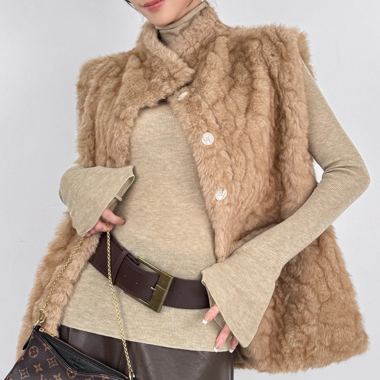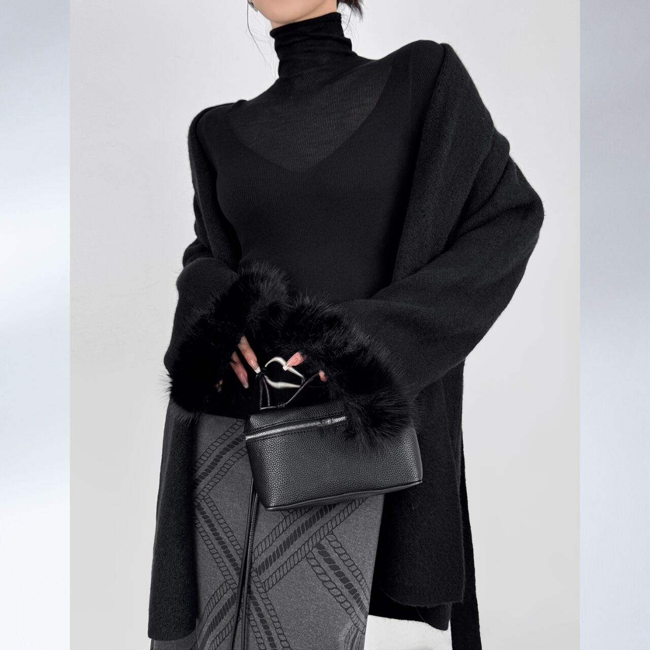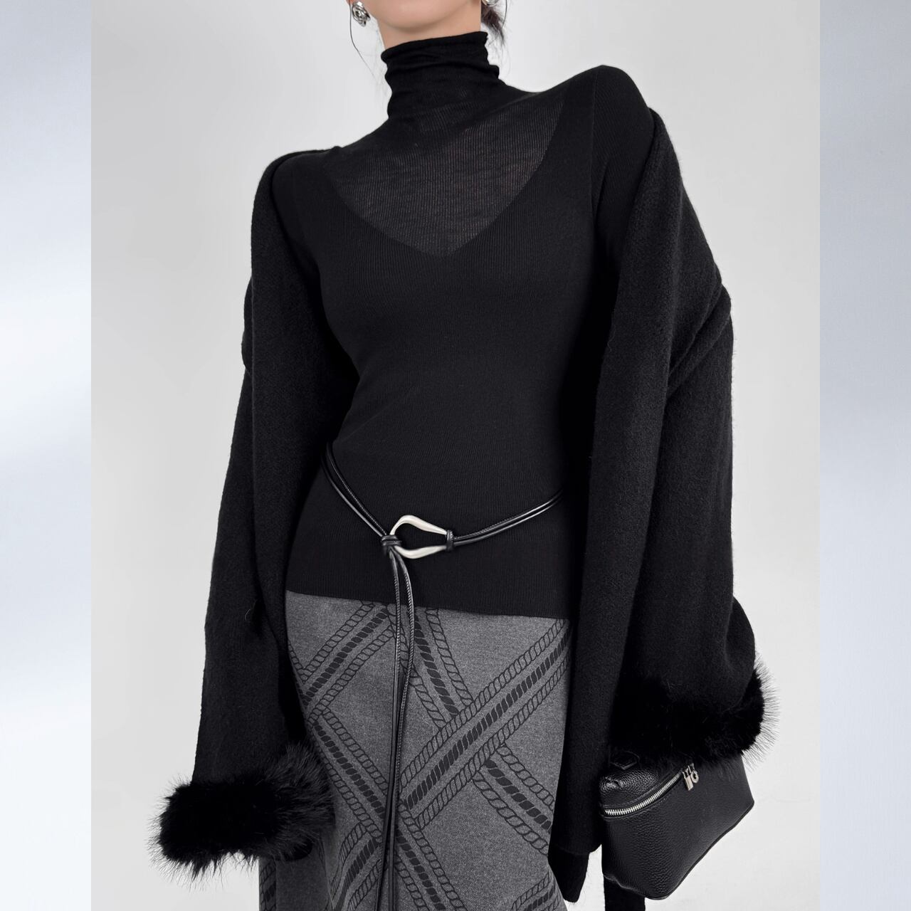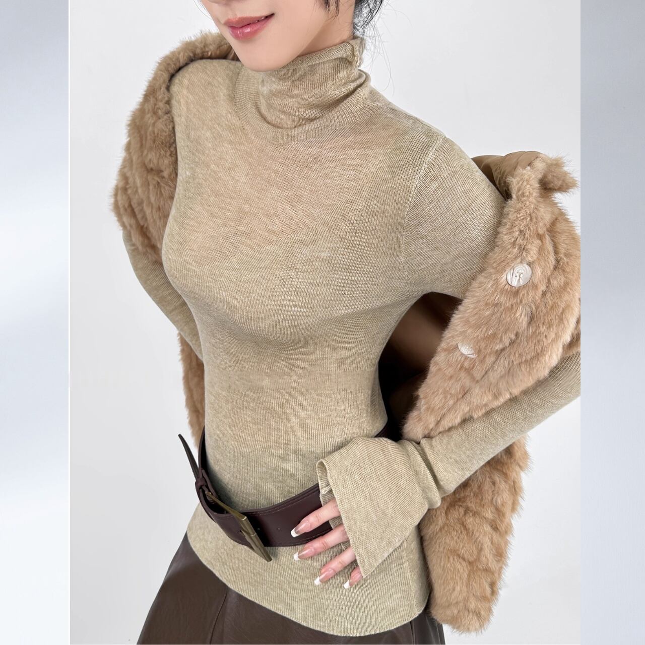 ボディラインに沿うリブと、広がるフレアスリーブのバランスが美しく、着るだけで洗練された印象に。