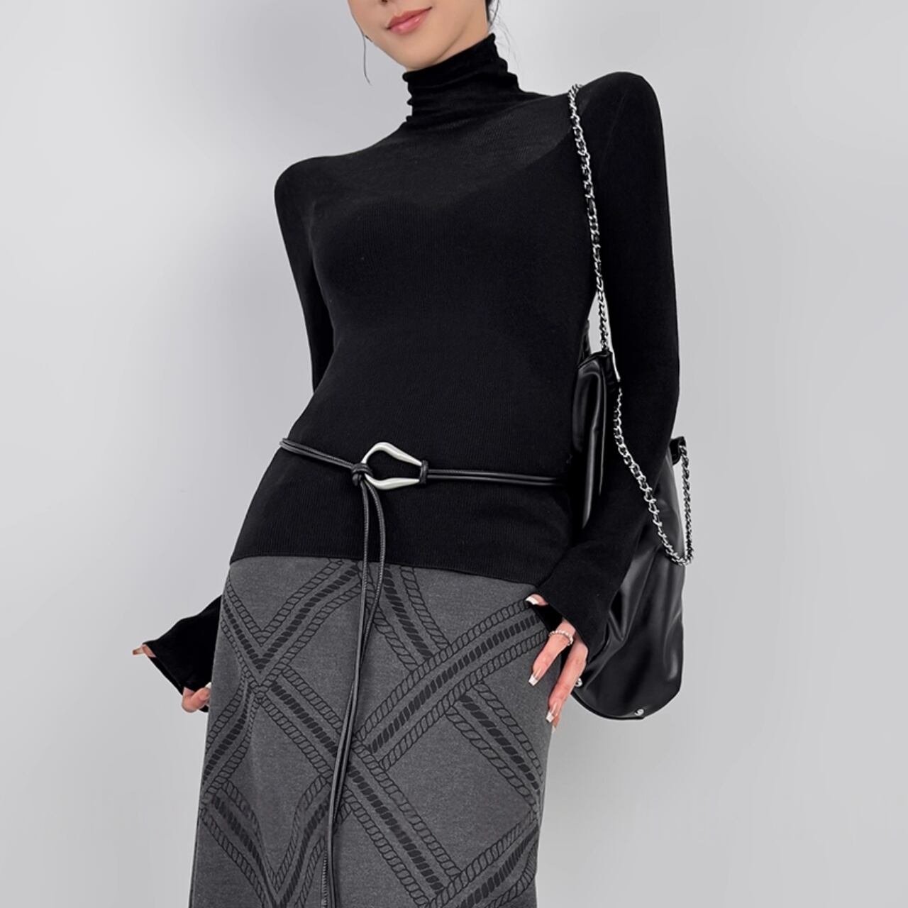 透け感のあるカットラインが繊細に浮かび上がる、ミニマルでモードな一着。