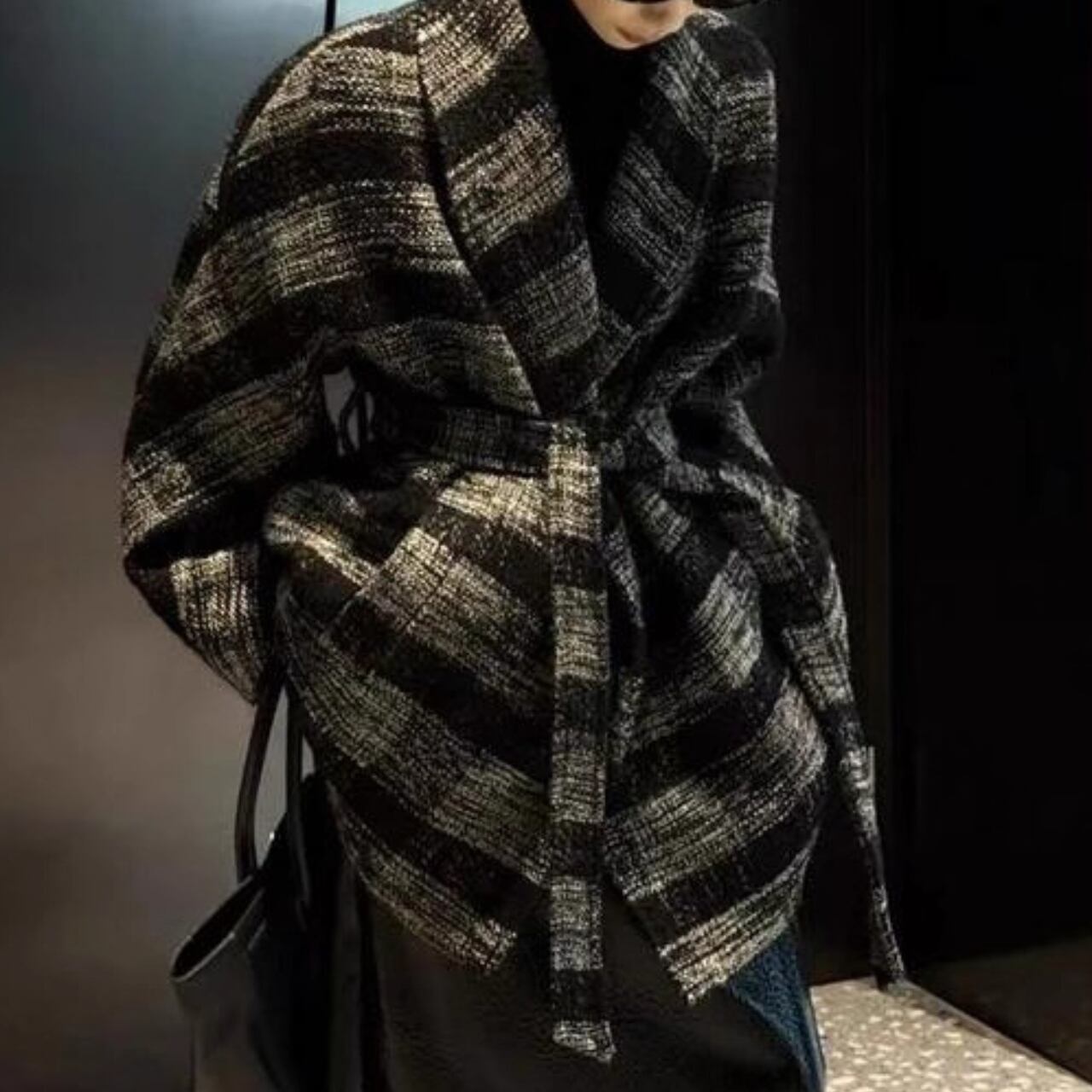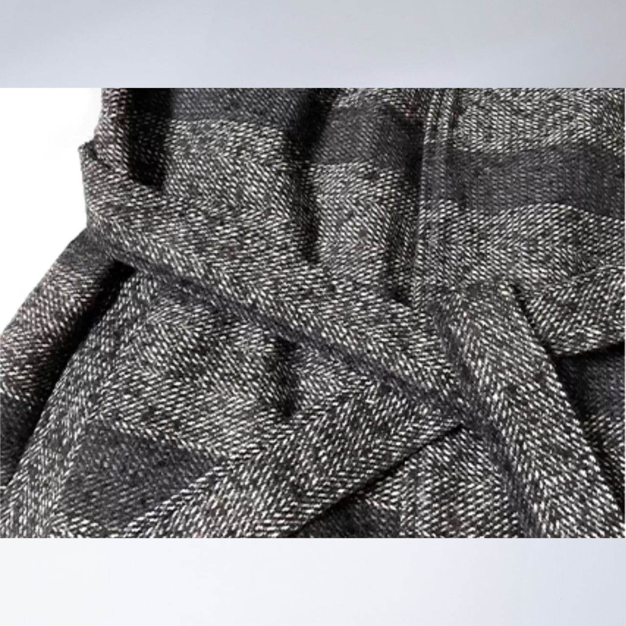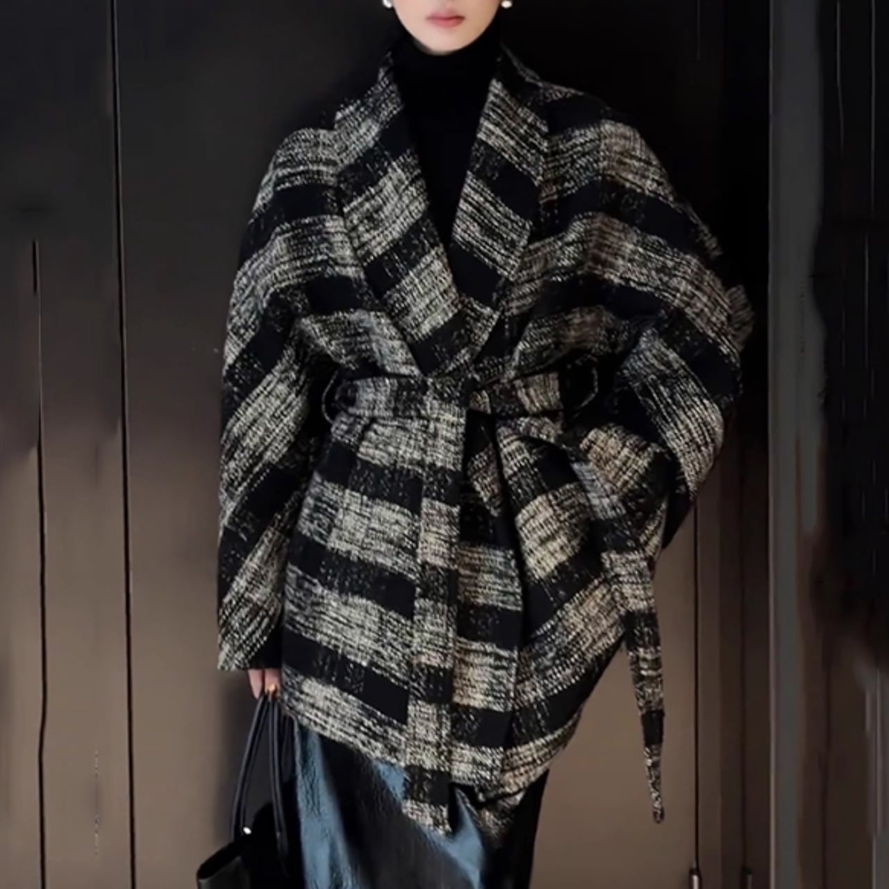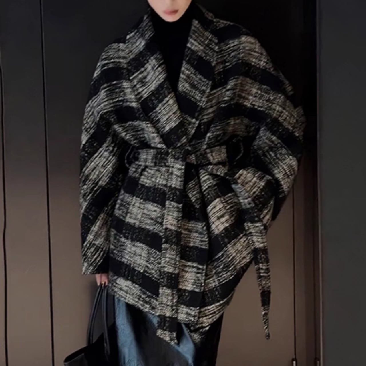 まるでノイズのような柄の揺らぎと、構築的なシルエットが印象に残る一着。