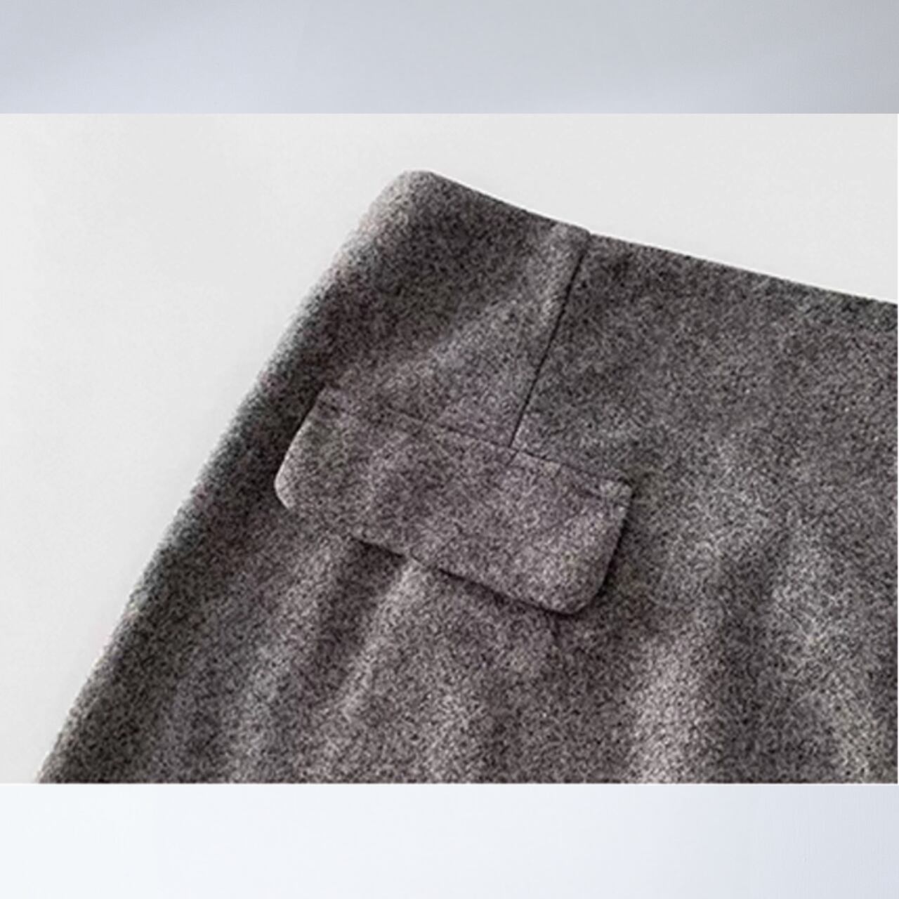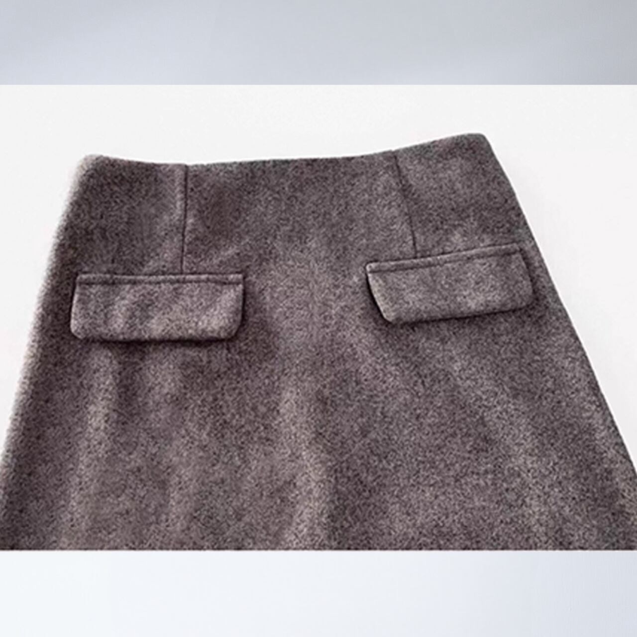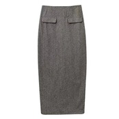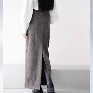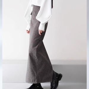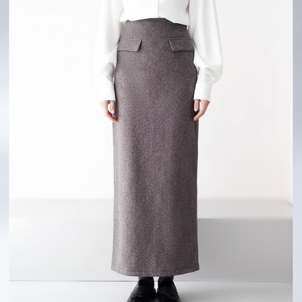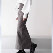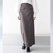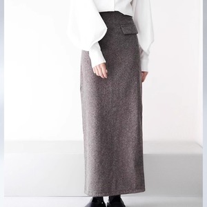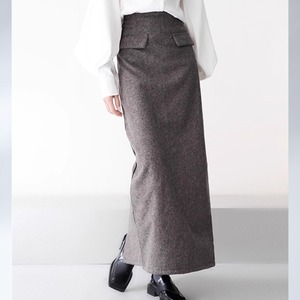 すっきりとしたシルエットに、ミニマルなフラップポケットがアクセント。シンプルなのに、どこかモードな印象を与えるロングスカートです。