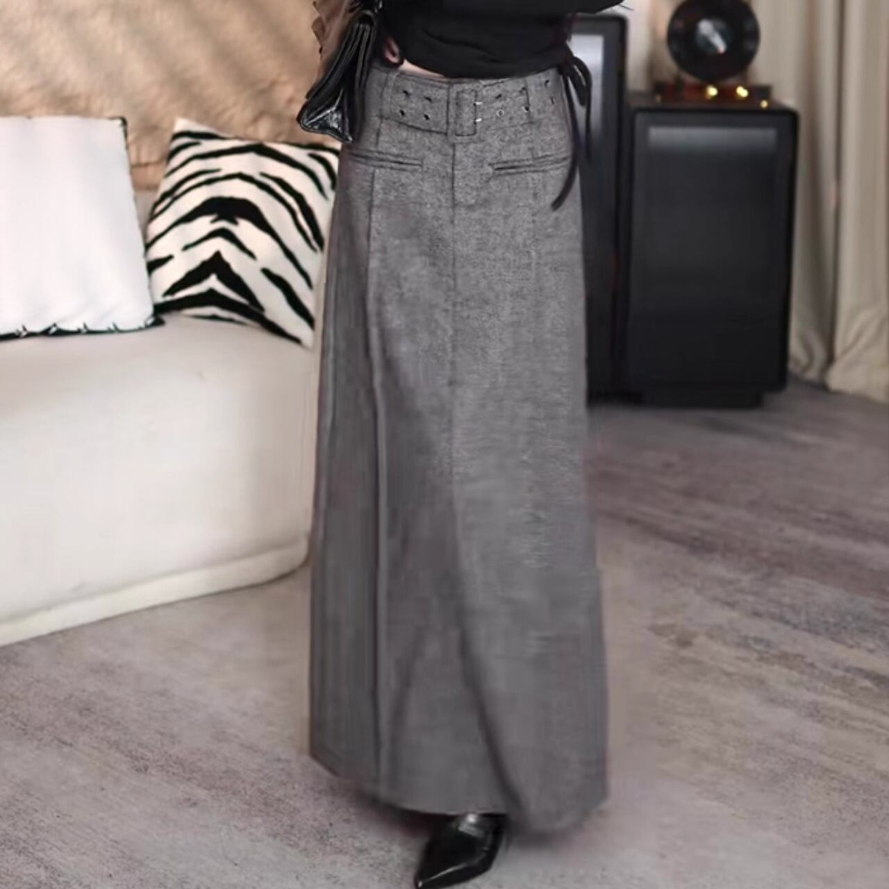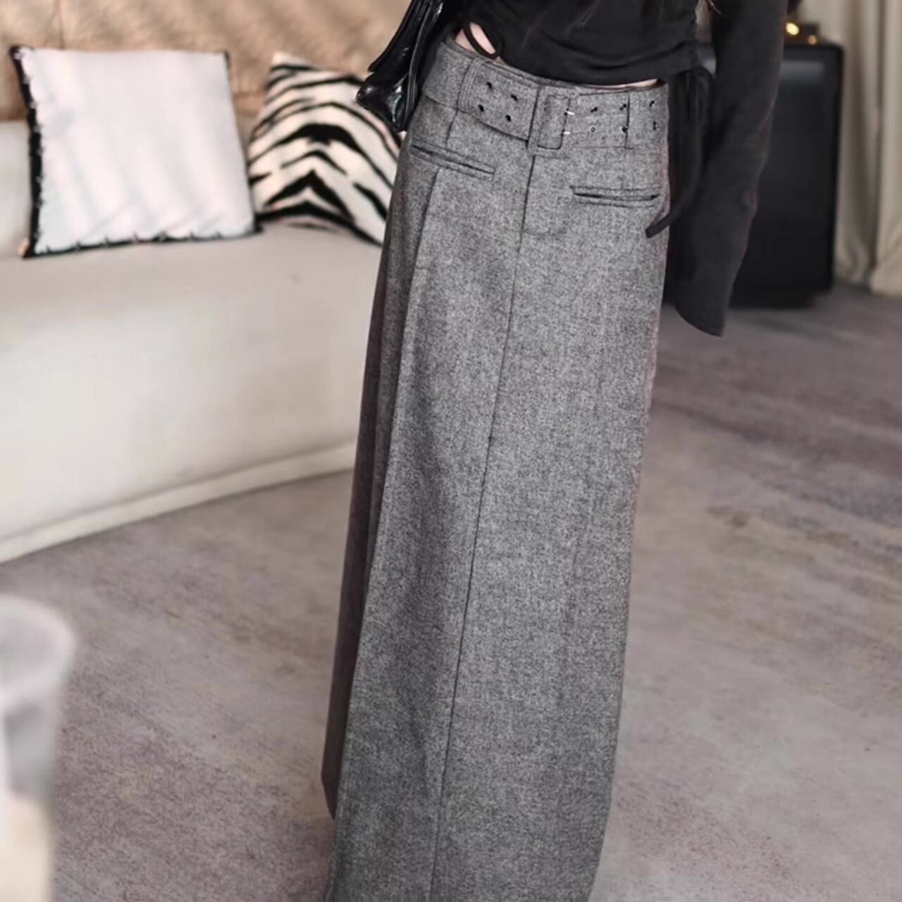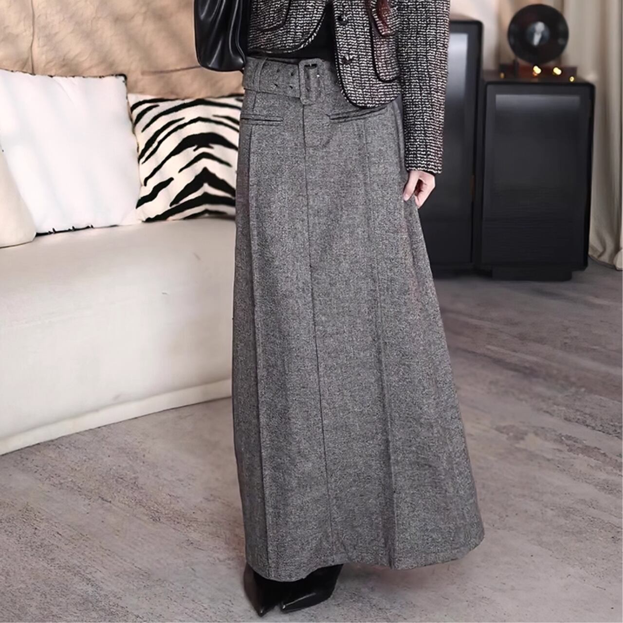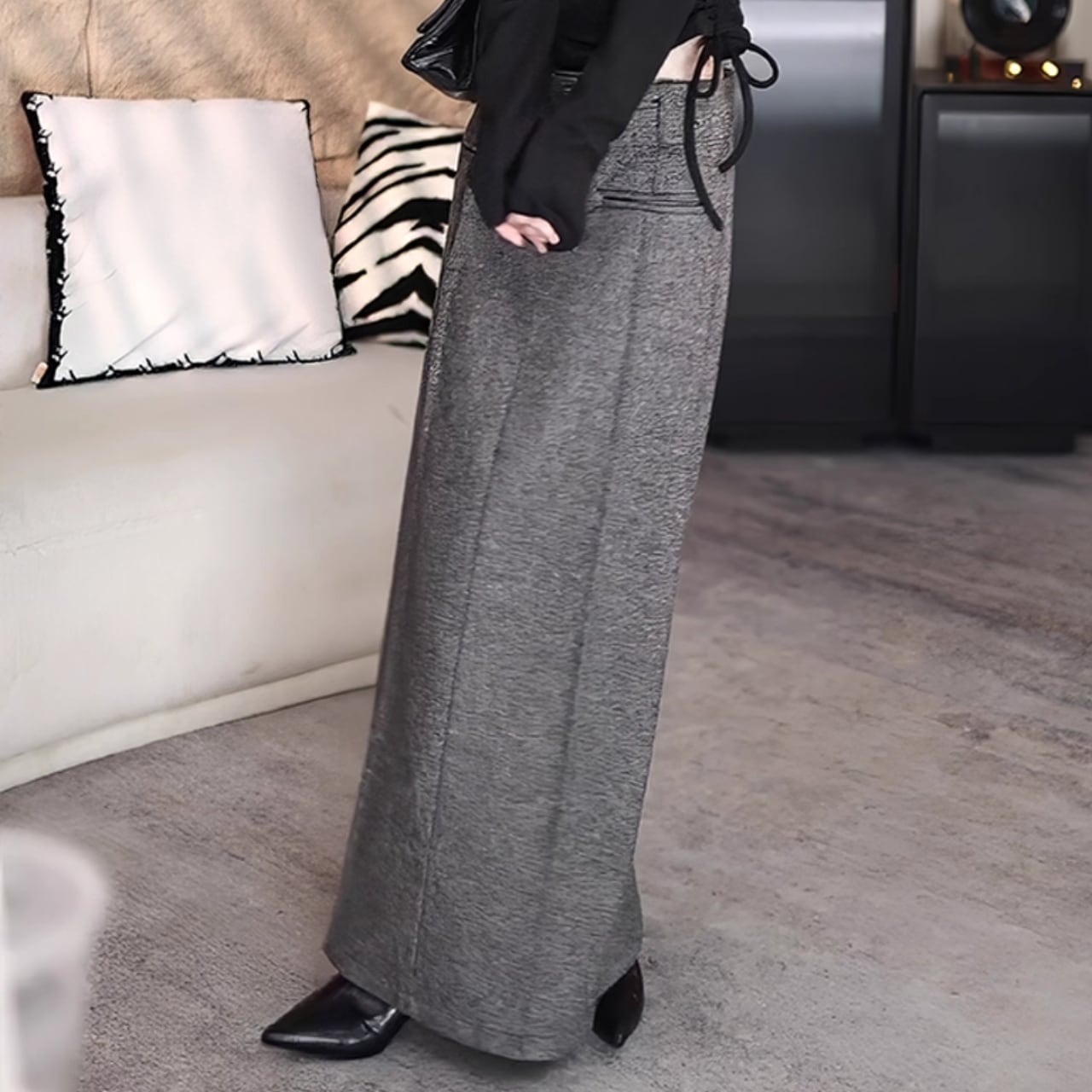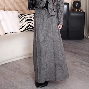 直線的なセンタープレスが映える、ワイドシルエットのロングスカート。