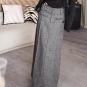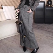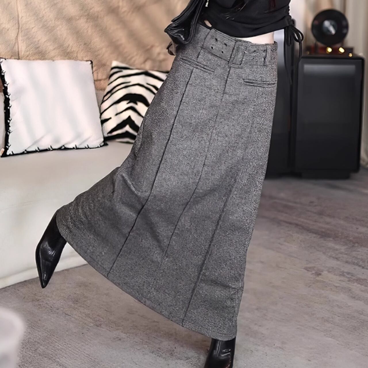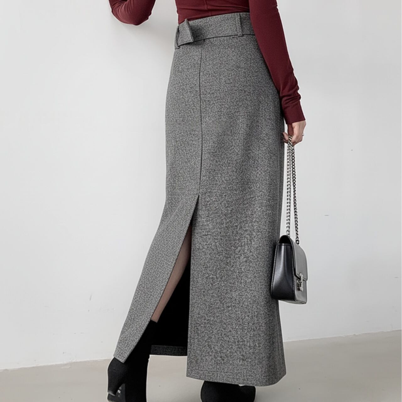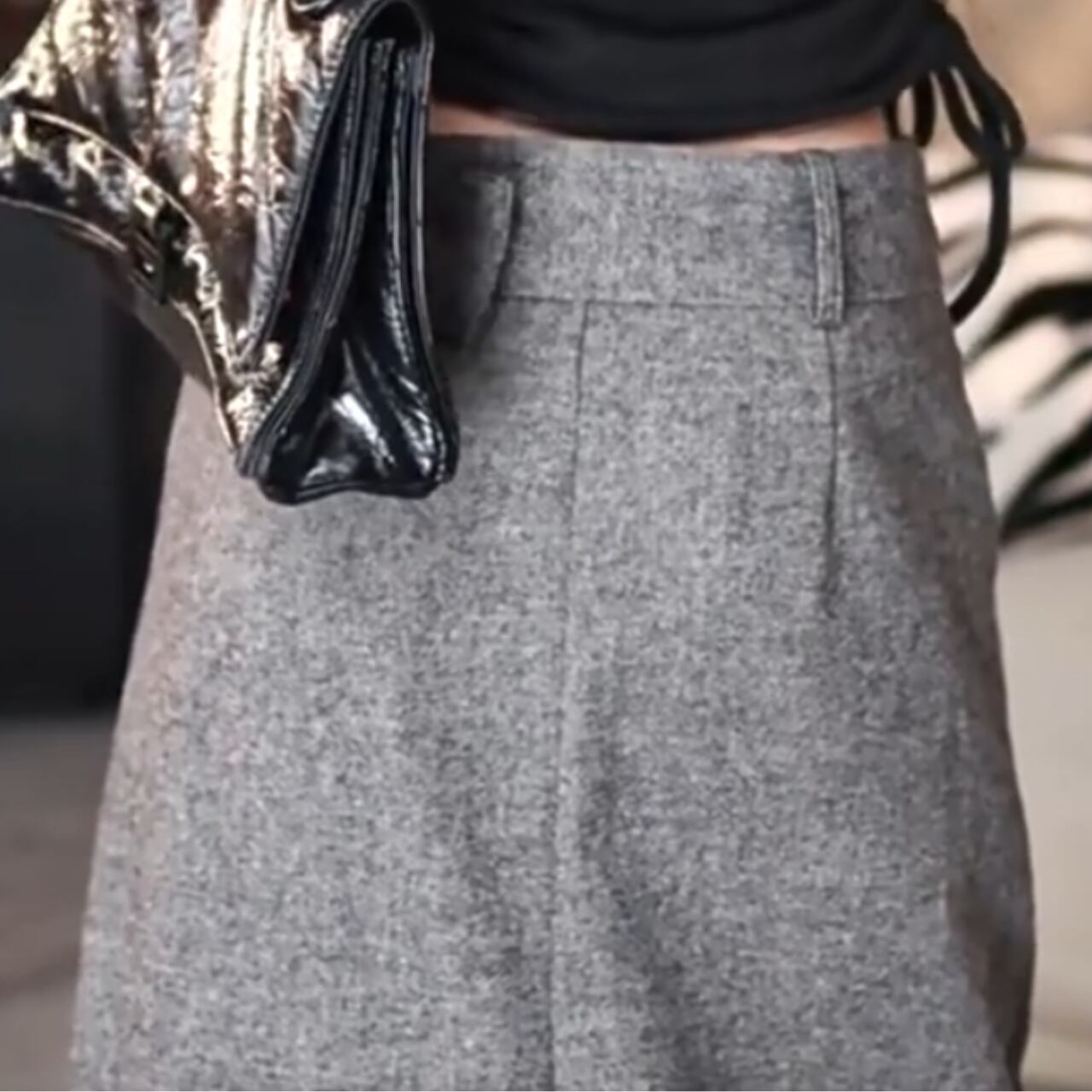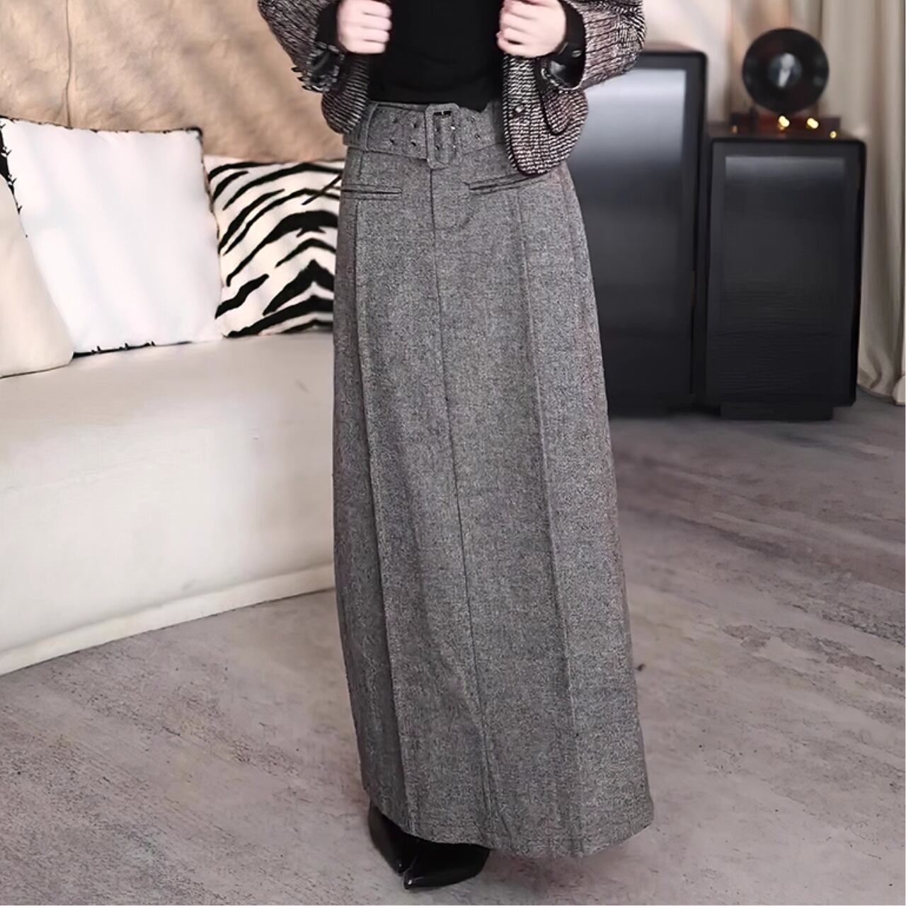 直線的なセンタープレスが映える、ワイドシルエットのロングスカート。
