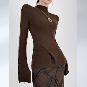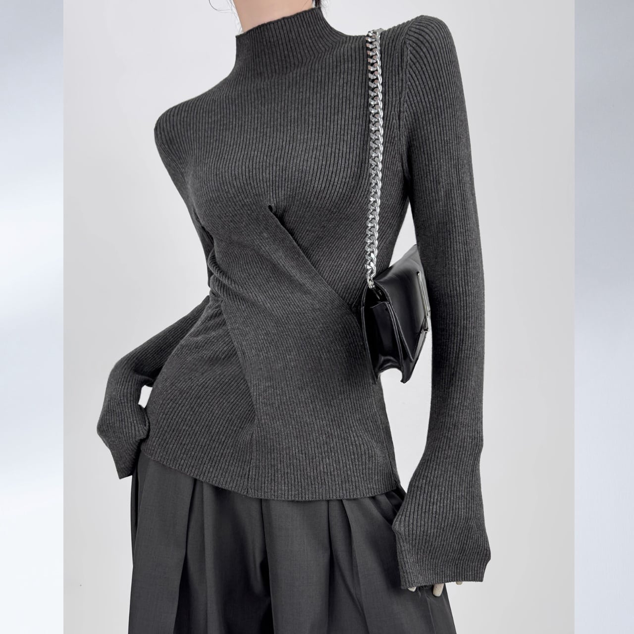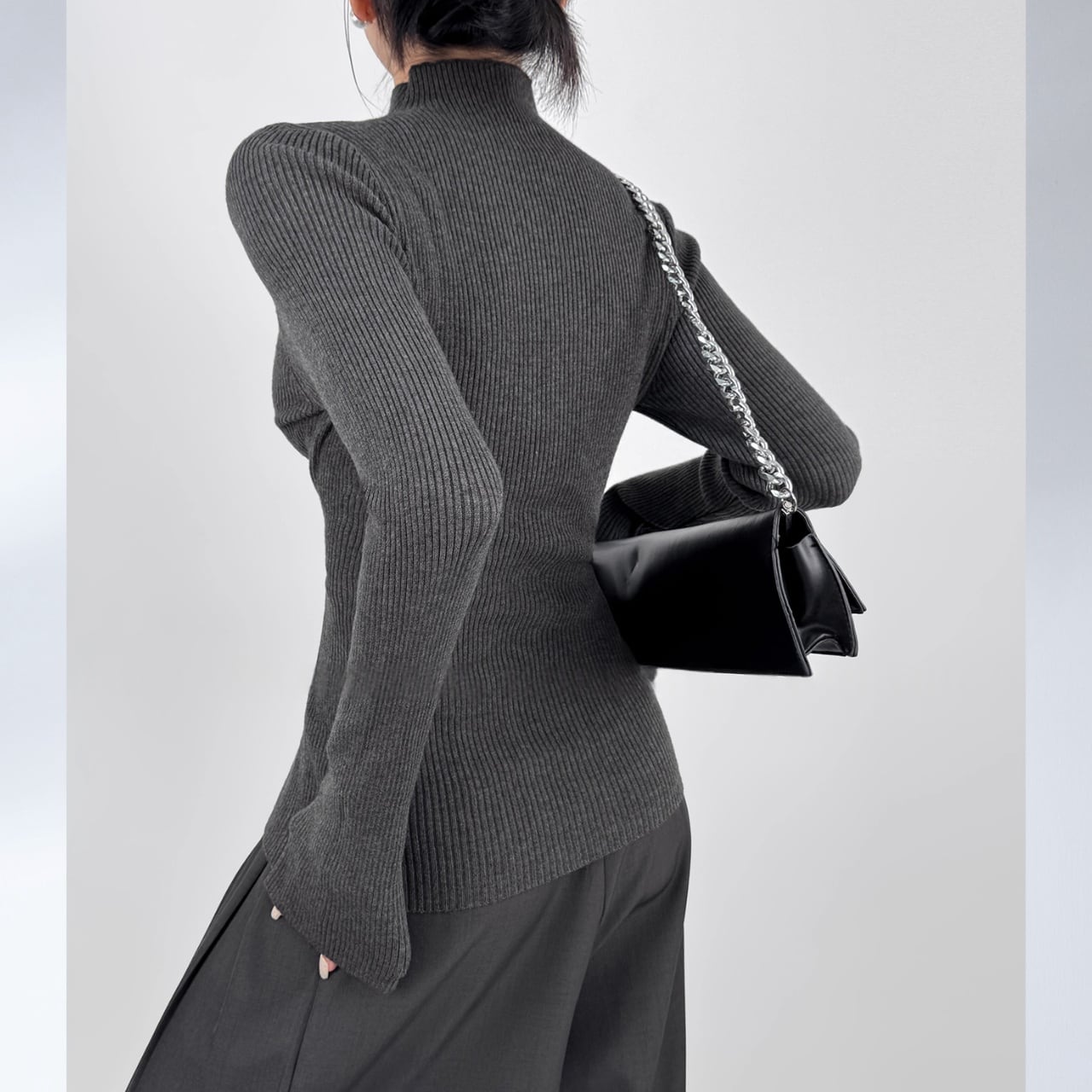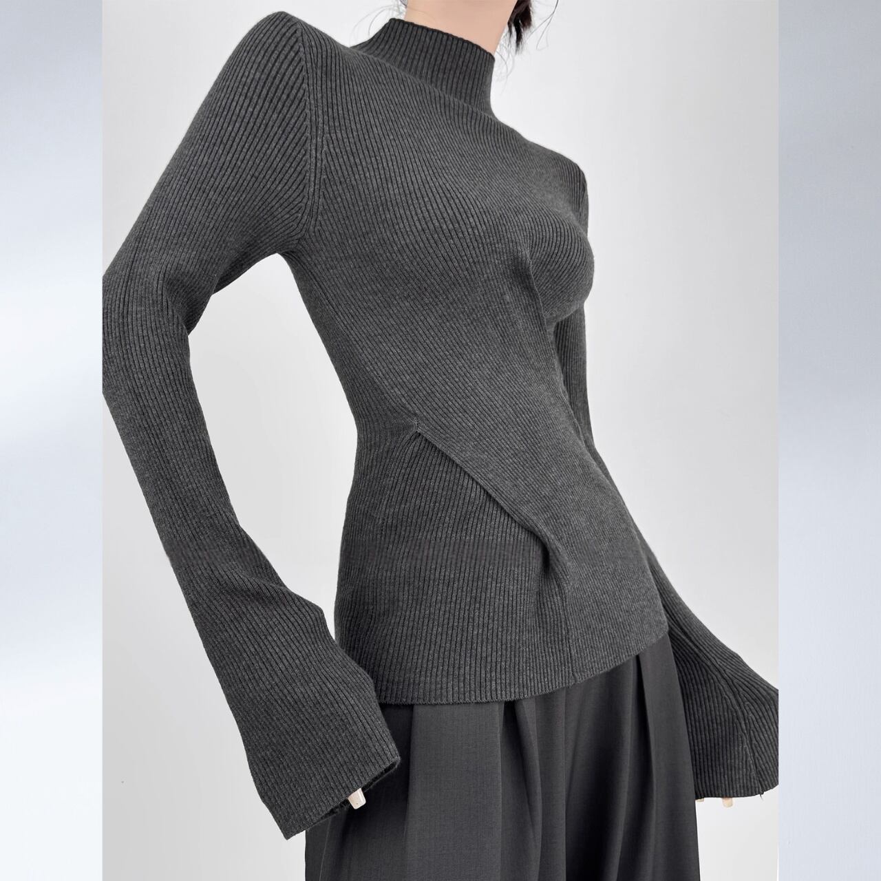 アシンメトリーなシルエットとリブの表情が、ミニマルの中に静かなインパクトを宿すモードな一枚。