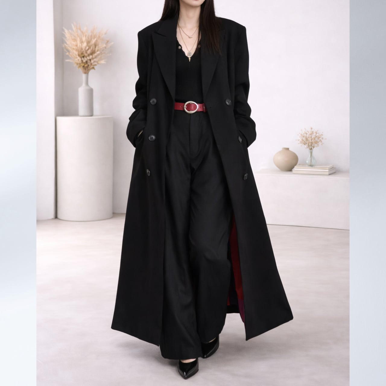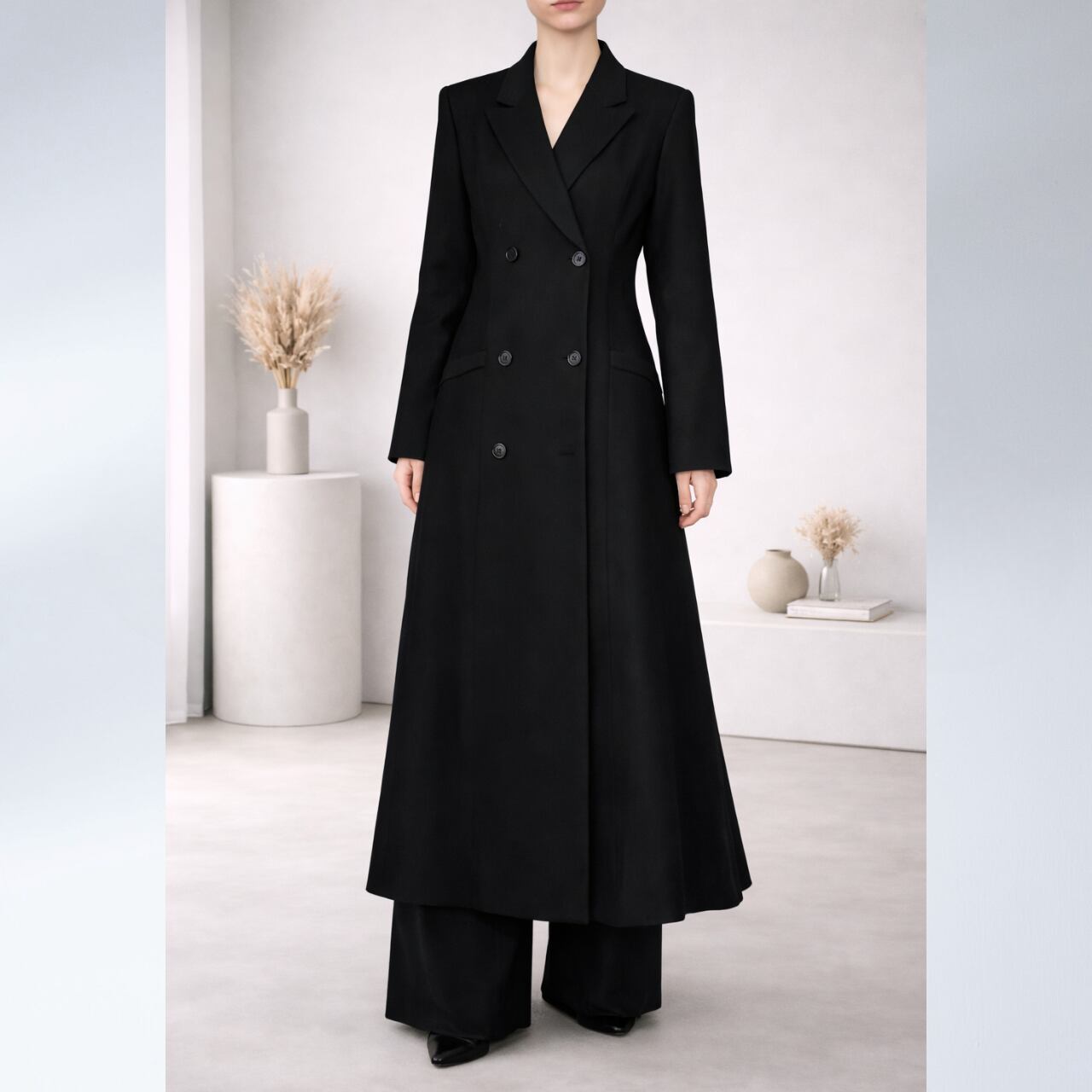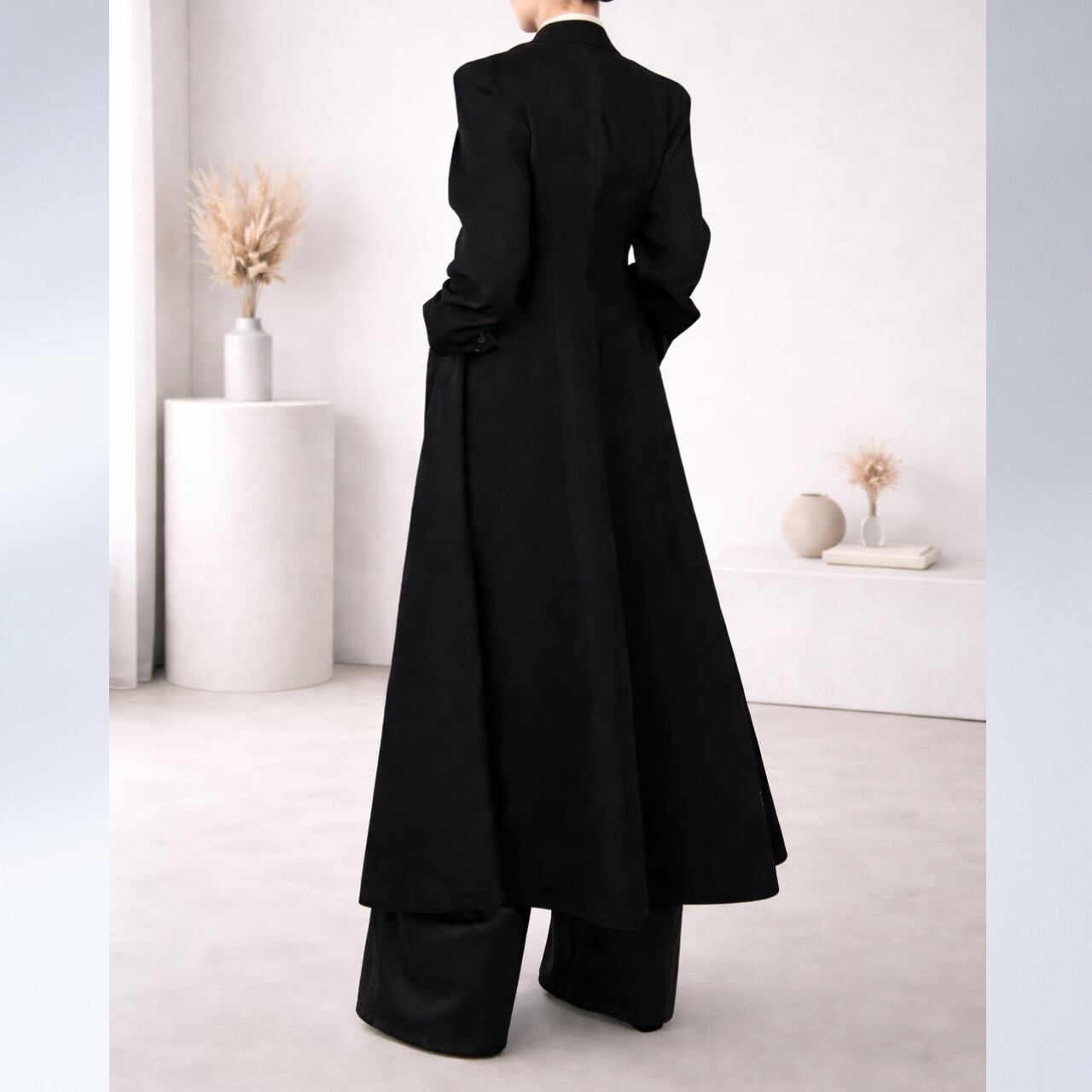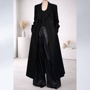 歩くたびに揺れる美しいフレアシルエットが印象的なロングコート。