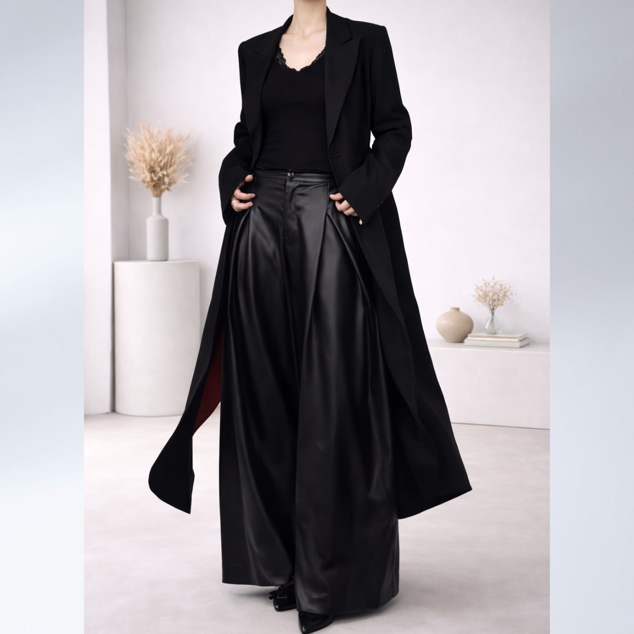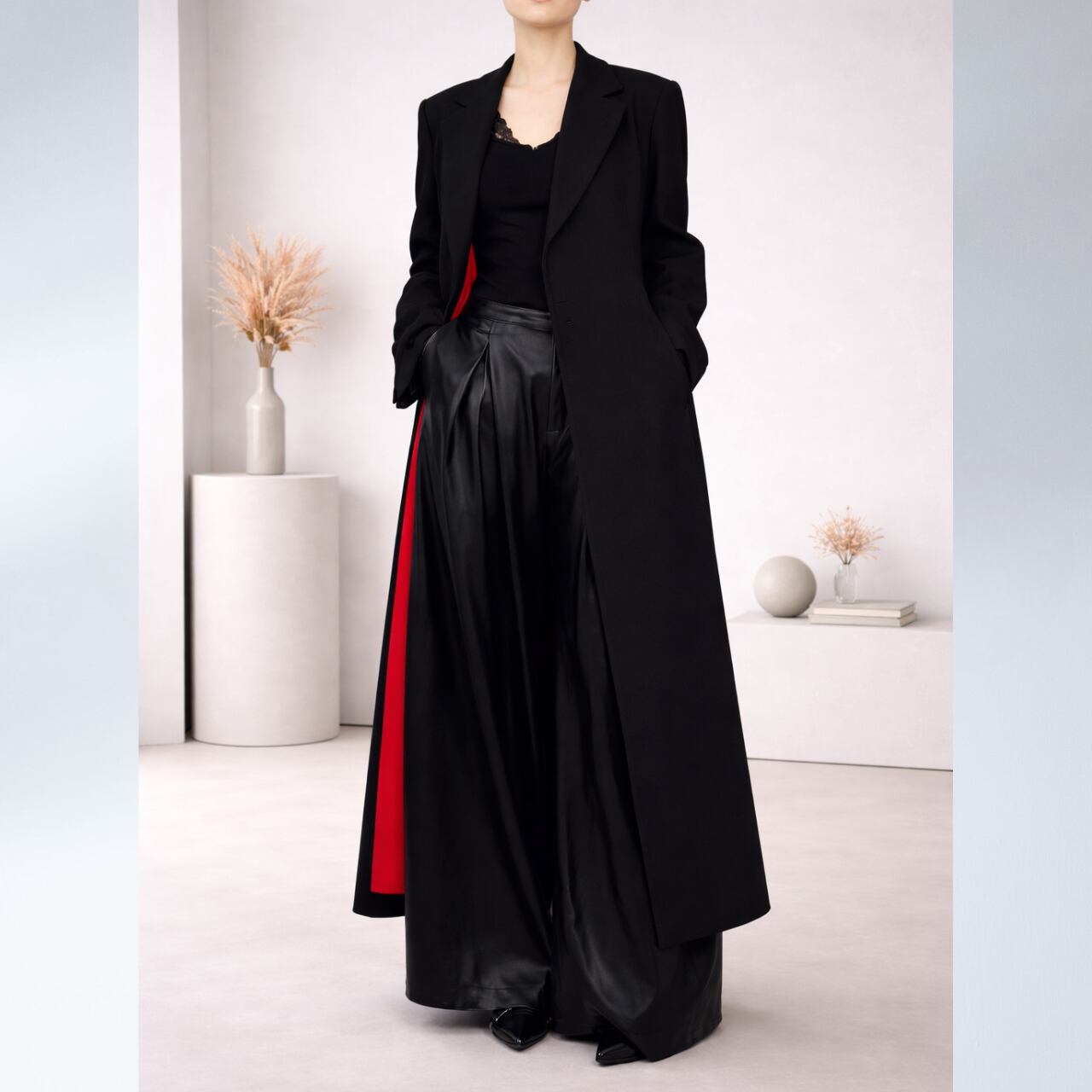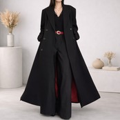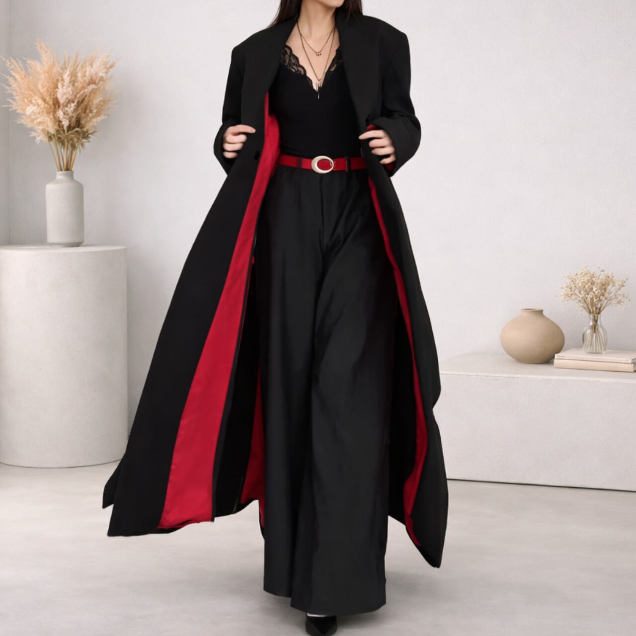 歩くたびに揺れる美しいフレアシルエットが印象的なロングコート。
