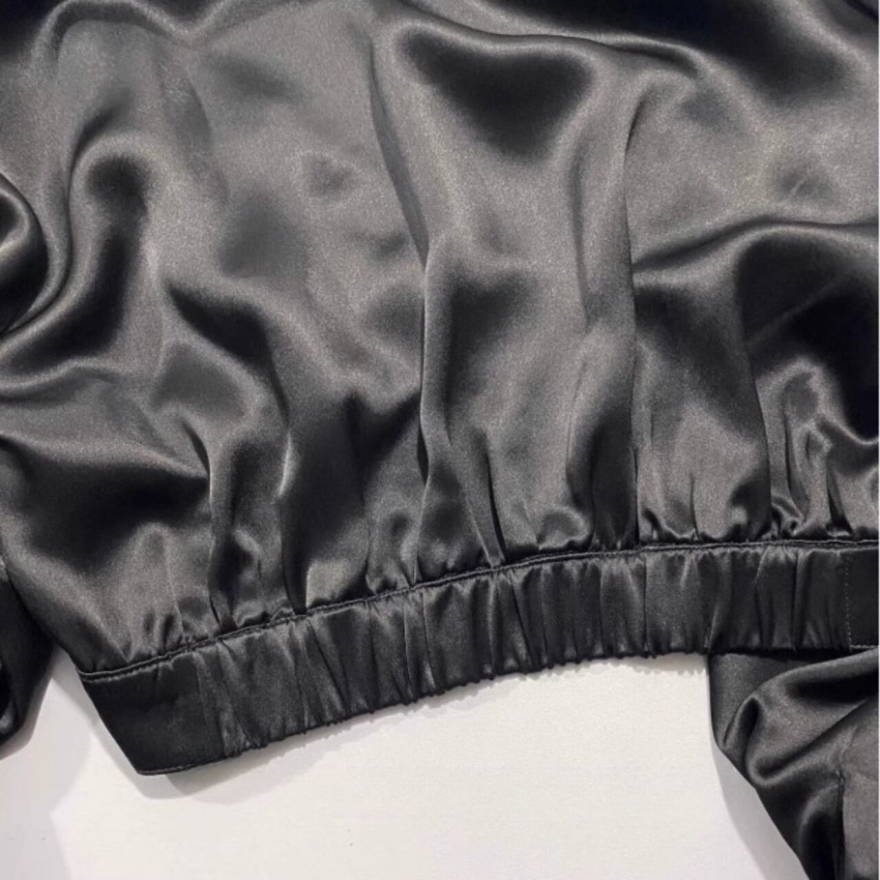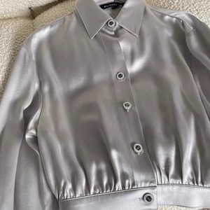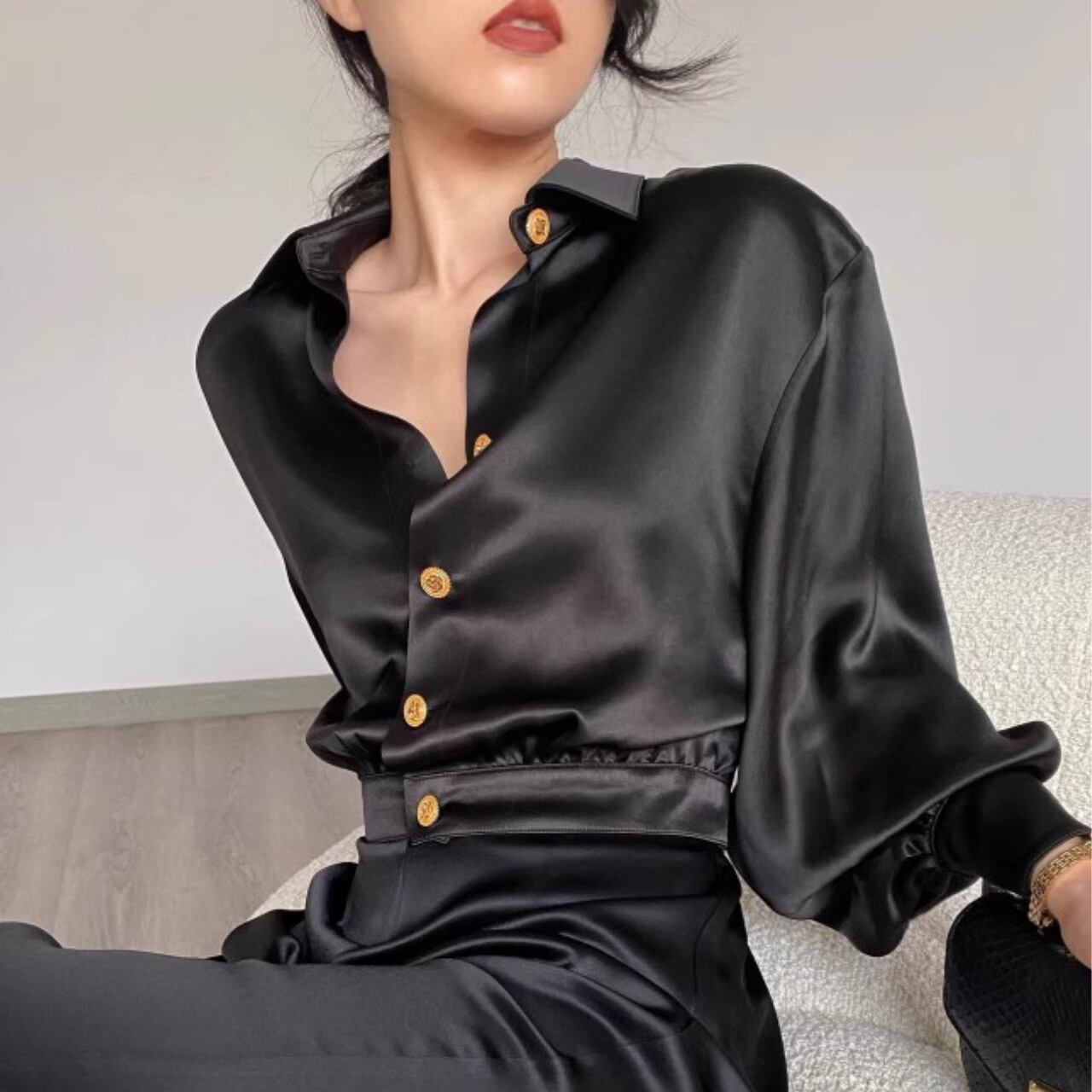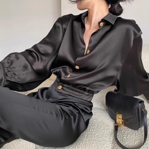 滑らかなサテン生地で、光沢感が上品な印象を与えるシャツは、