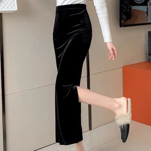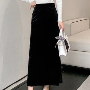 ベロア調の素材が魅力、ハイウエストで美しいシルエットを演出するスリット入りタイトスカート。