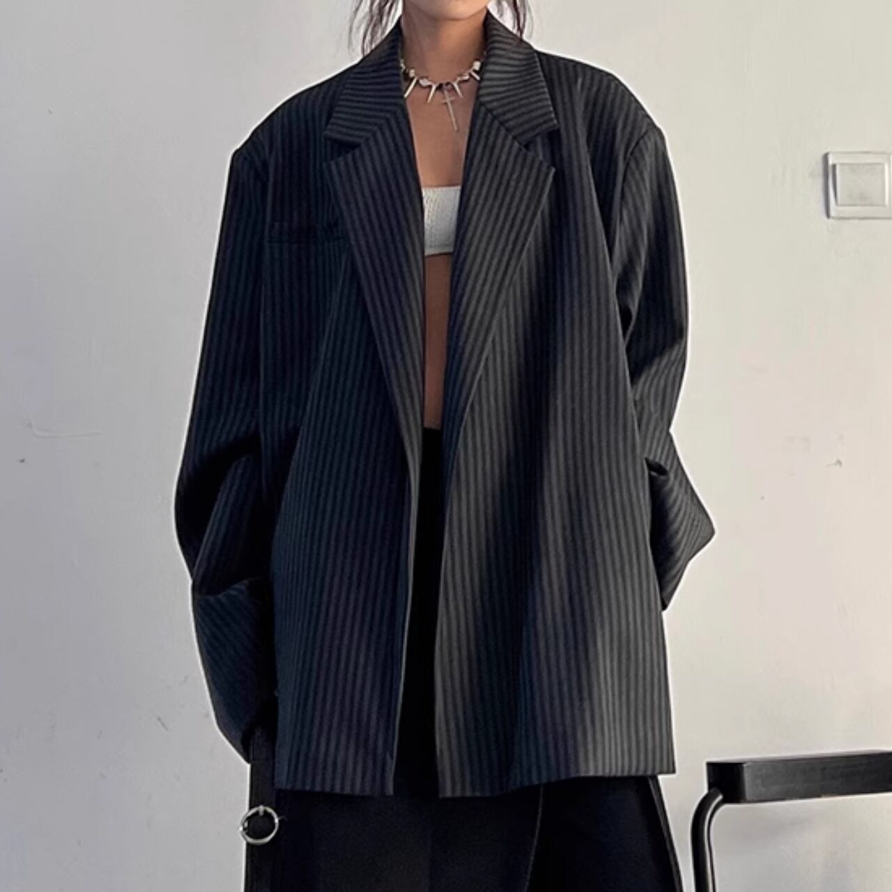 ゆったりとしたシルエットが魅力のストライプオーバーサイズジャケット。