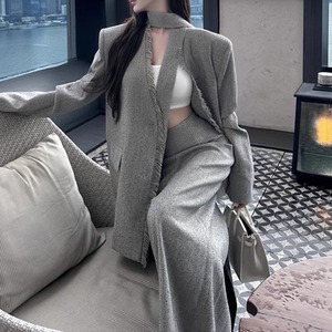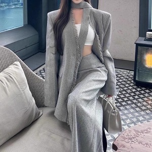 スカーフ風のジャケットがユニークなアクセントを加え、