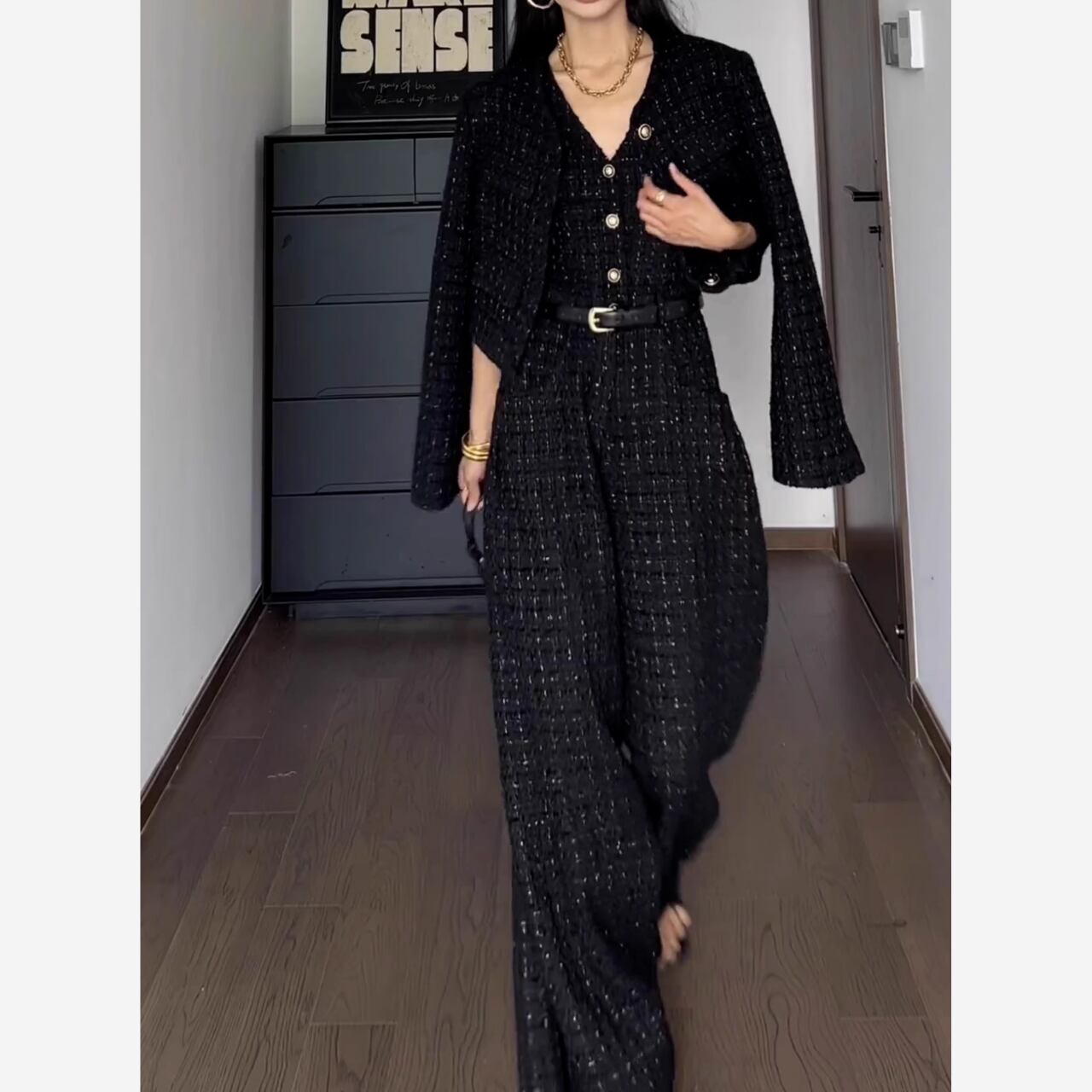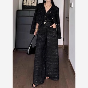 ジャケットとワイドパンツの組み合わせで、クラシックな中にもモダンな要素をプラス。