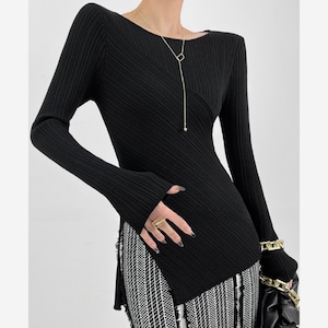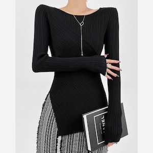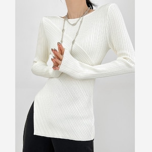 スタイリッシュなアシンメトリーデザインが目を引くリブトップス。