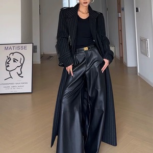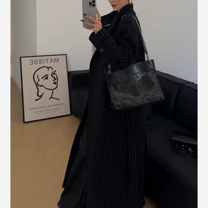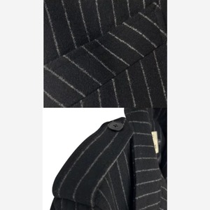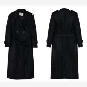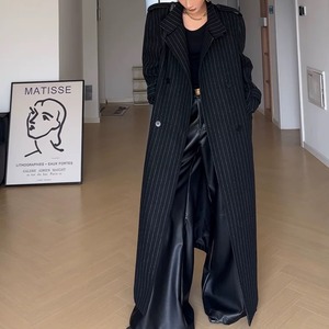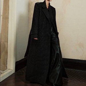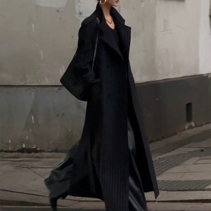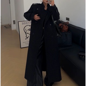 シックなブラックのストライプ柄で、洗練された大人のスタイルを演出するロングコート。