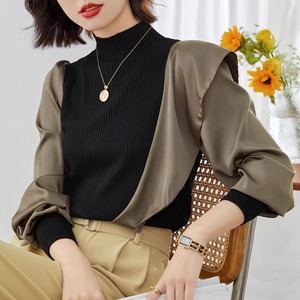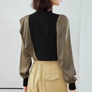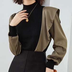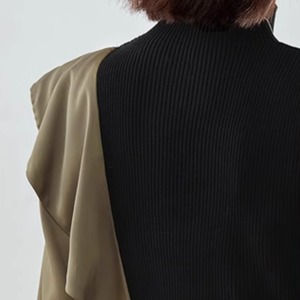 上品なブラックとカーキのコントラストが目を引く、アシンメトリーデザインのトップス。
